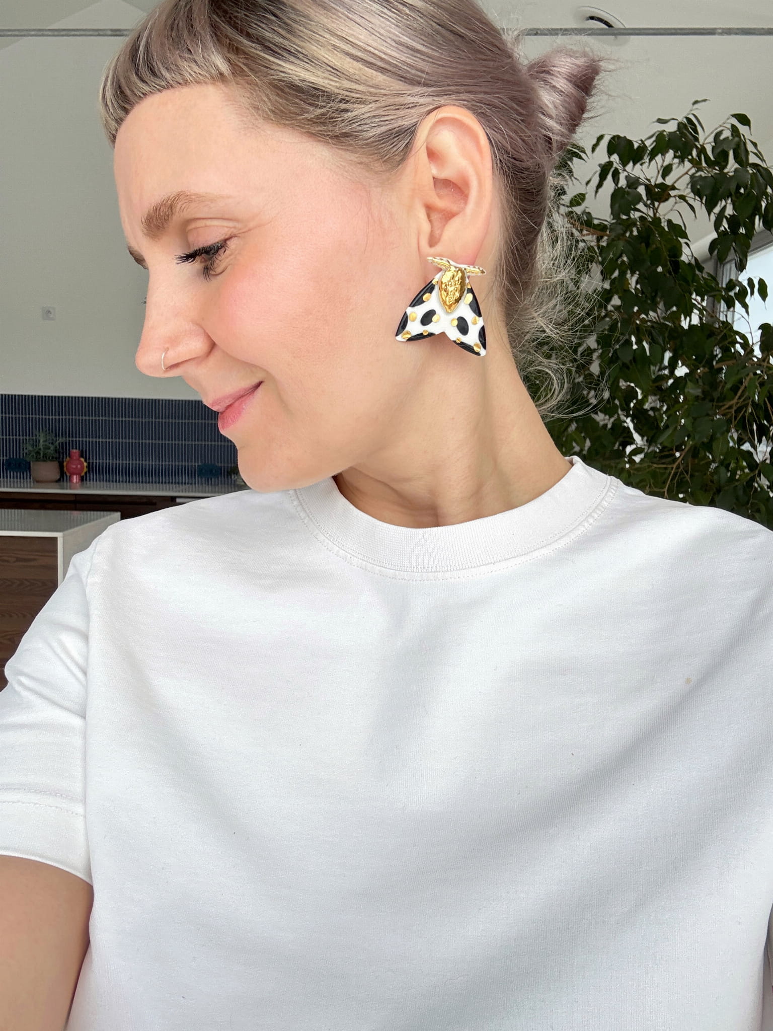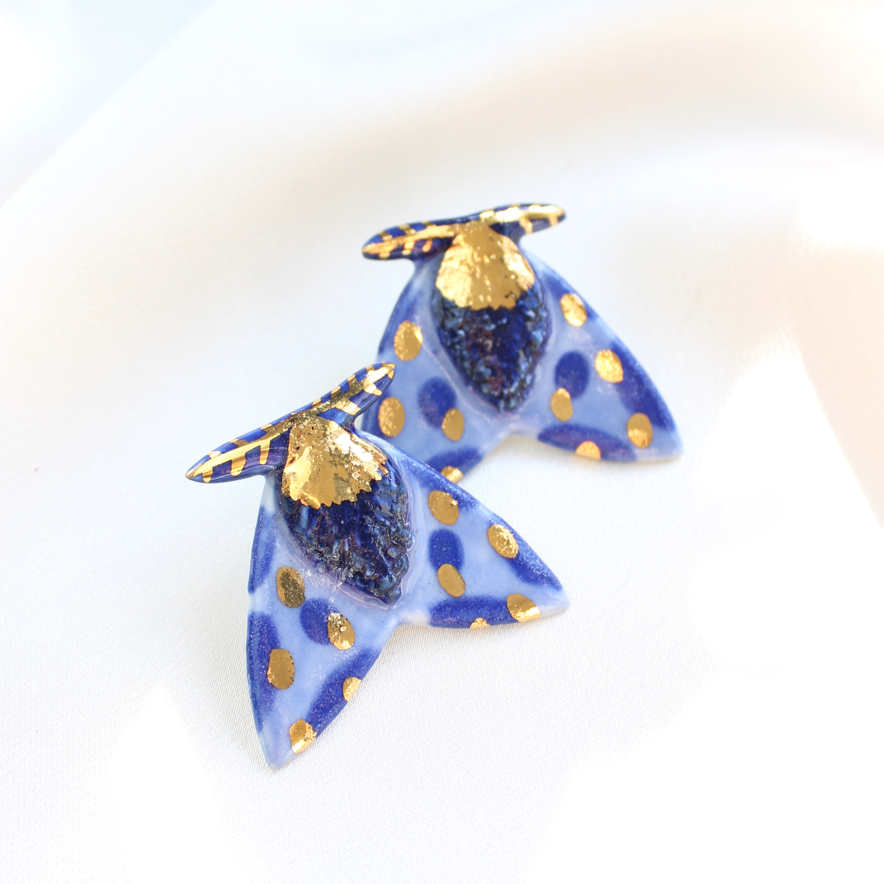 Kolczyki wykonane z porcelany, zdobione 24k złotem. Sztyfty wykonane zostały ze stali szlachetnej.