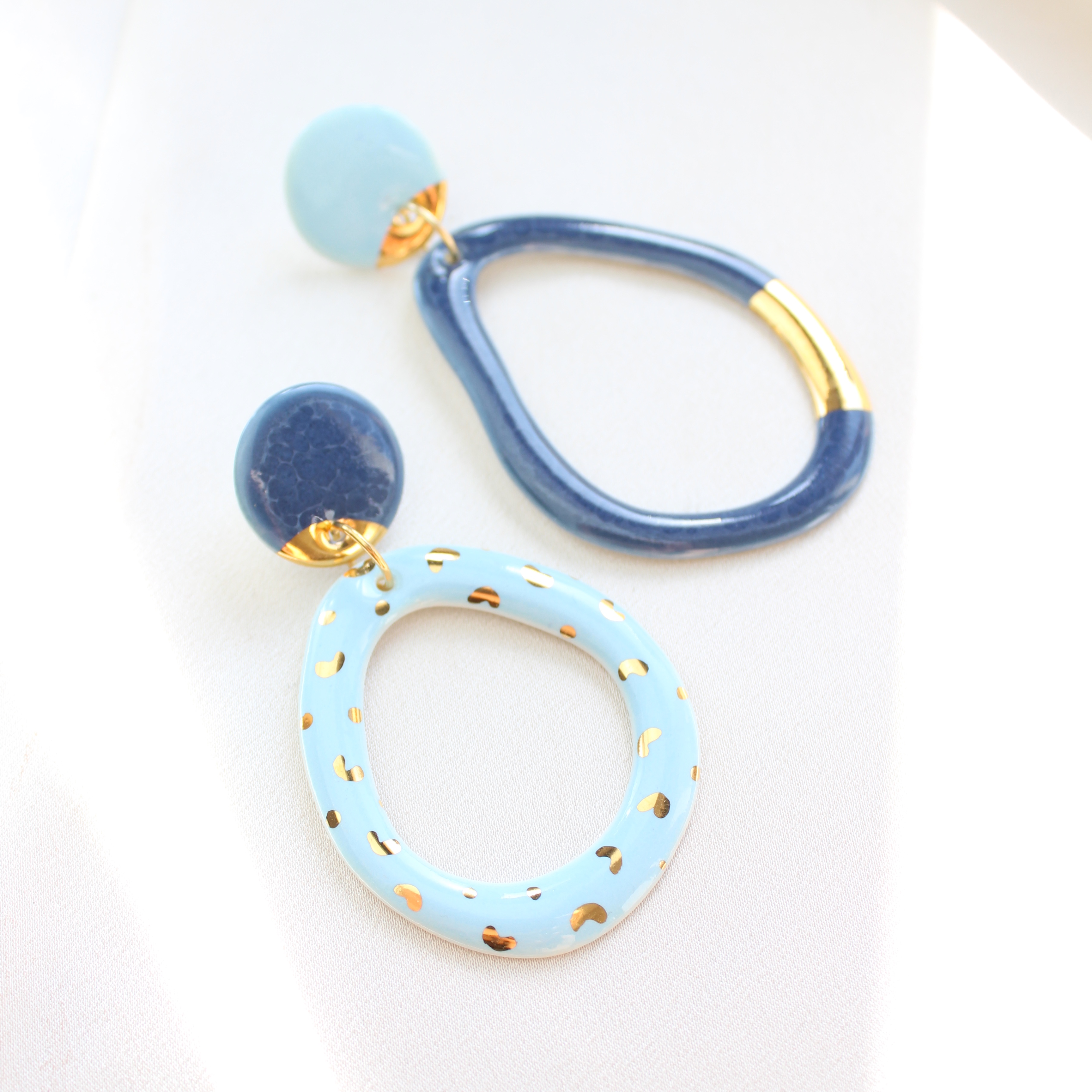 Kolczyki wykonane z porcelany, zdobione 24k złotem. Sztyfty wykonane zostały ze stali szlachetnej.