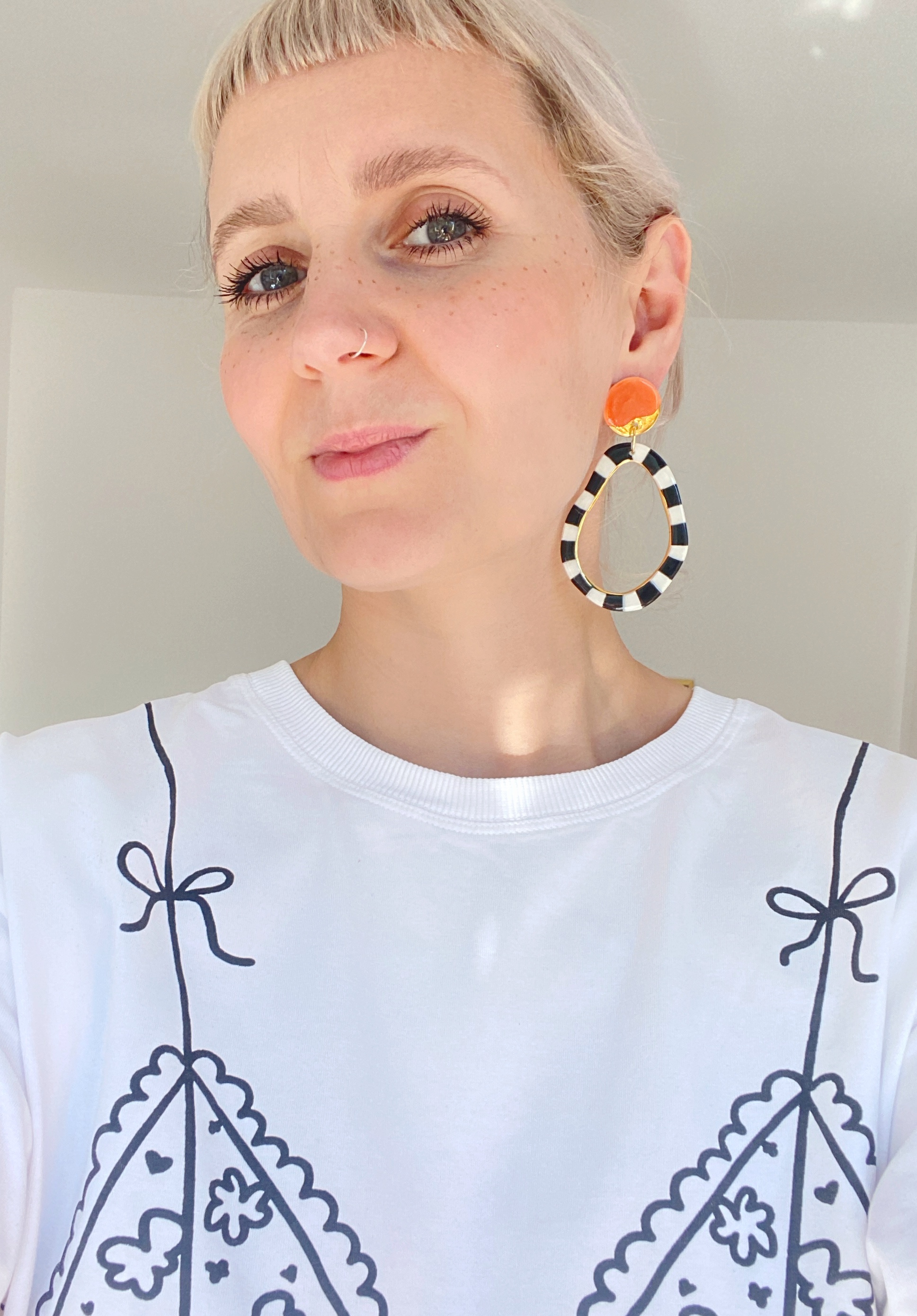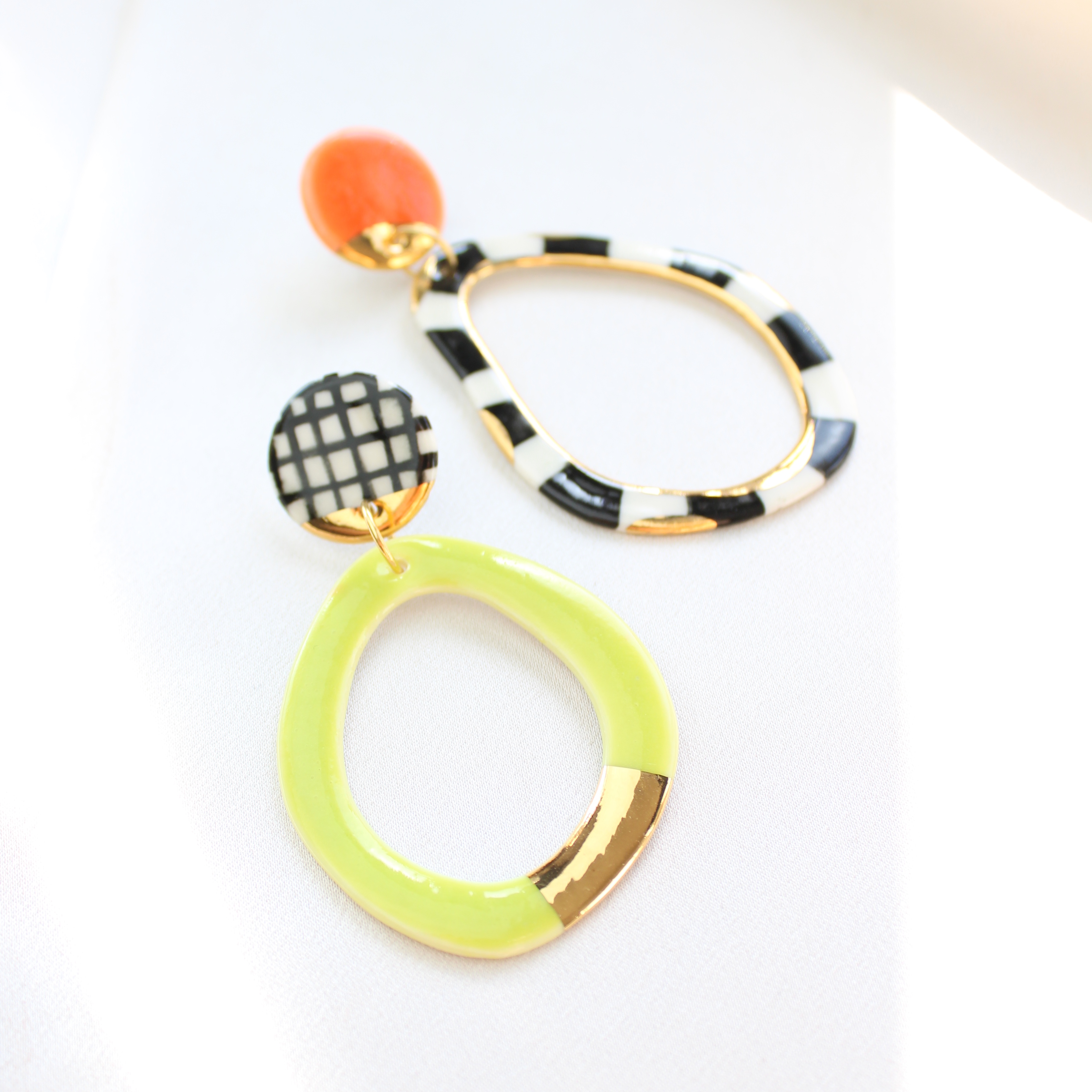 Kolczyki wykonane z porcelany, zdobione 24k złotem. Sztyfty wykonane zostały ze stali szlachetnej.