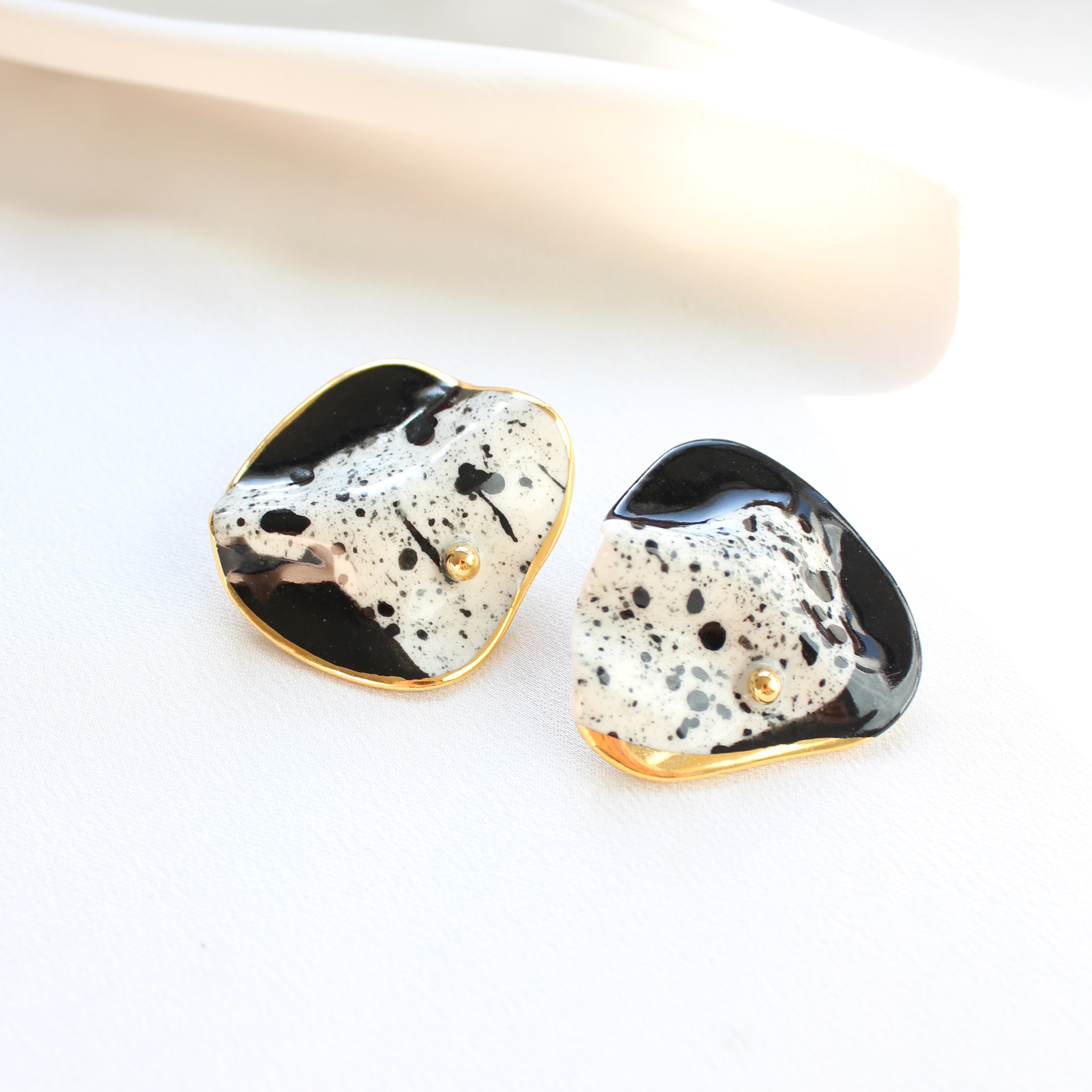 Kolczyki wykonane z porcelany, zdobione 24k złotem. Sztyfty wykonane zostały ze stali szlachetnej.