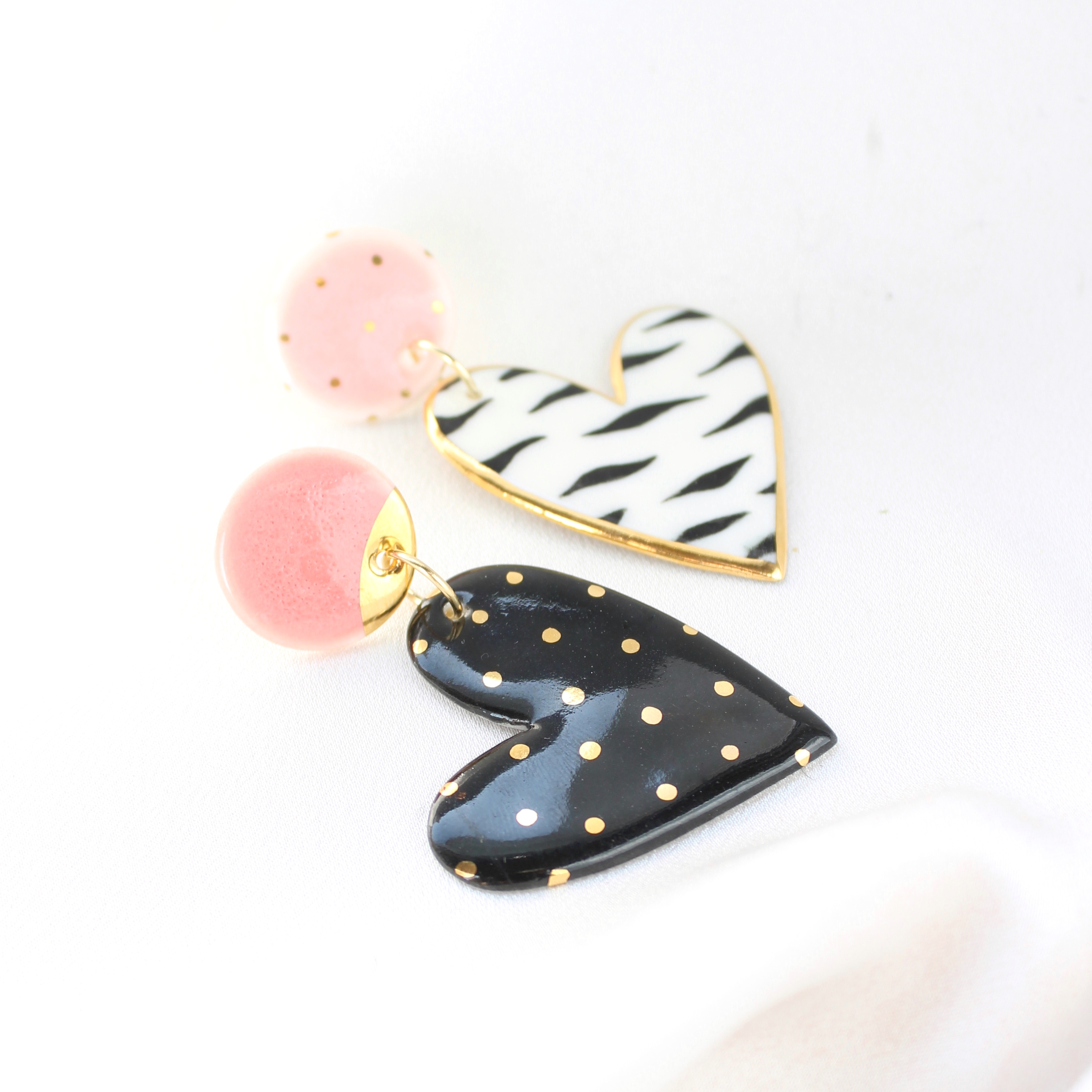 Kolczyki wykonane z porcelany, zdobione 24k złotem. Sztyfty wykonane zostały ze stali szlachetnej.