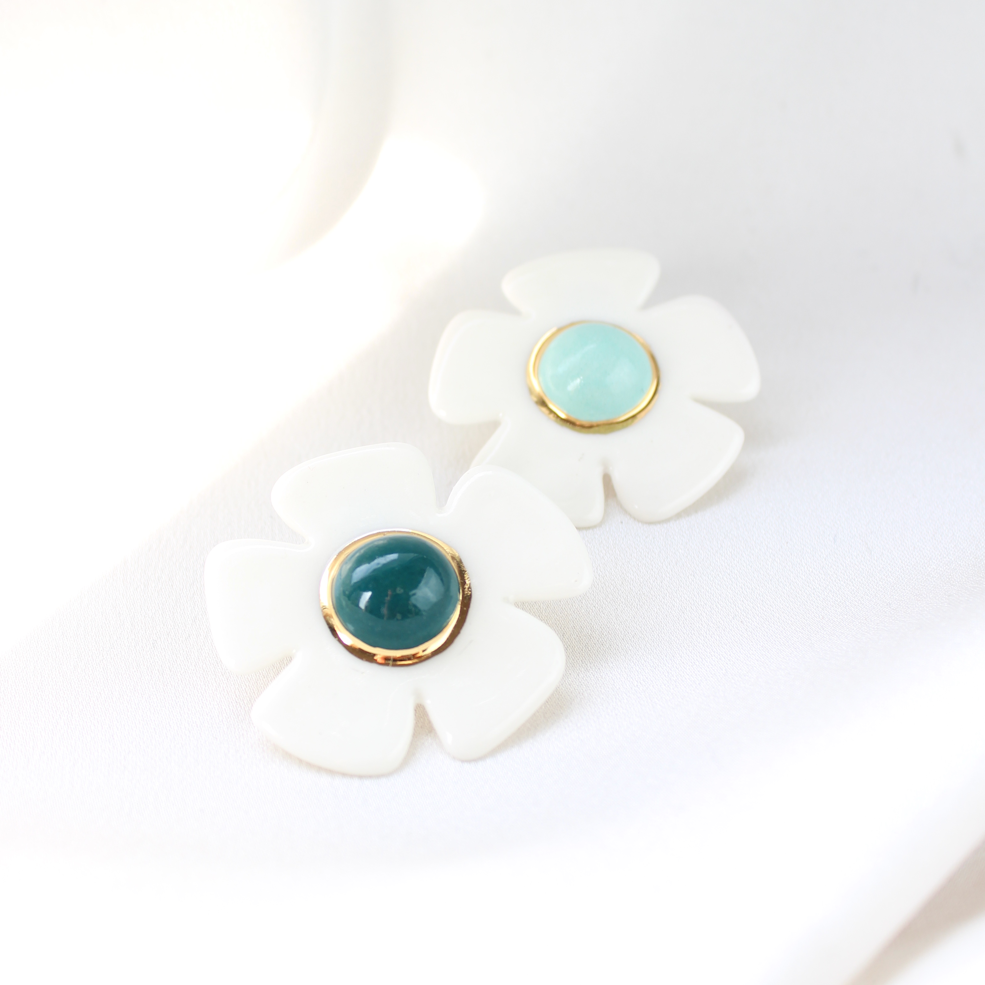 Kolczyki wykonane z porcelany, zdobione 24k złotem. Sztyfty wykonane zostały ze stali szlachetnej.