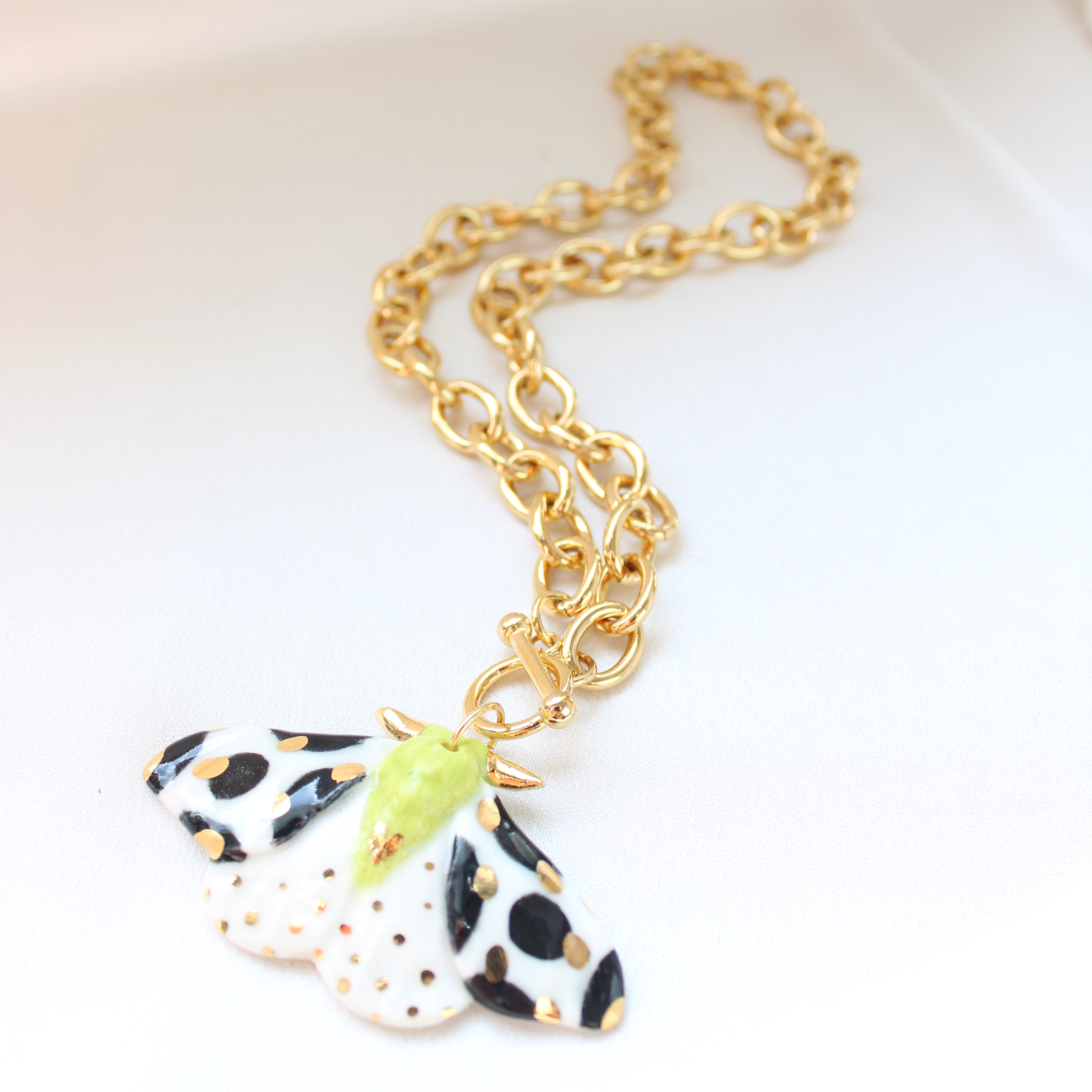 Porcelanowa zawieszka w kształcie ćmy na łańcuchu wykonanym ze stali szlachetnej w kolorze złotym.