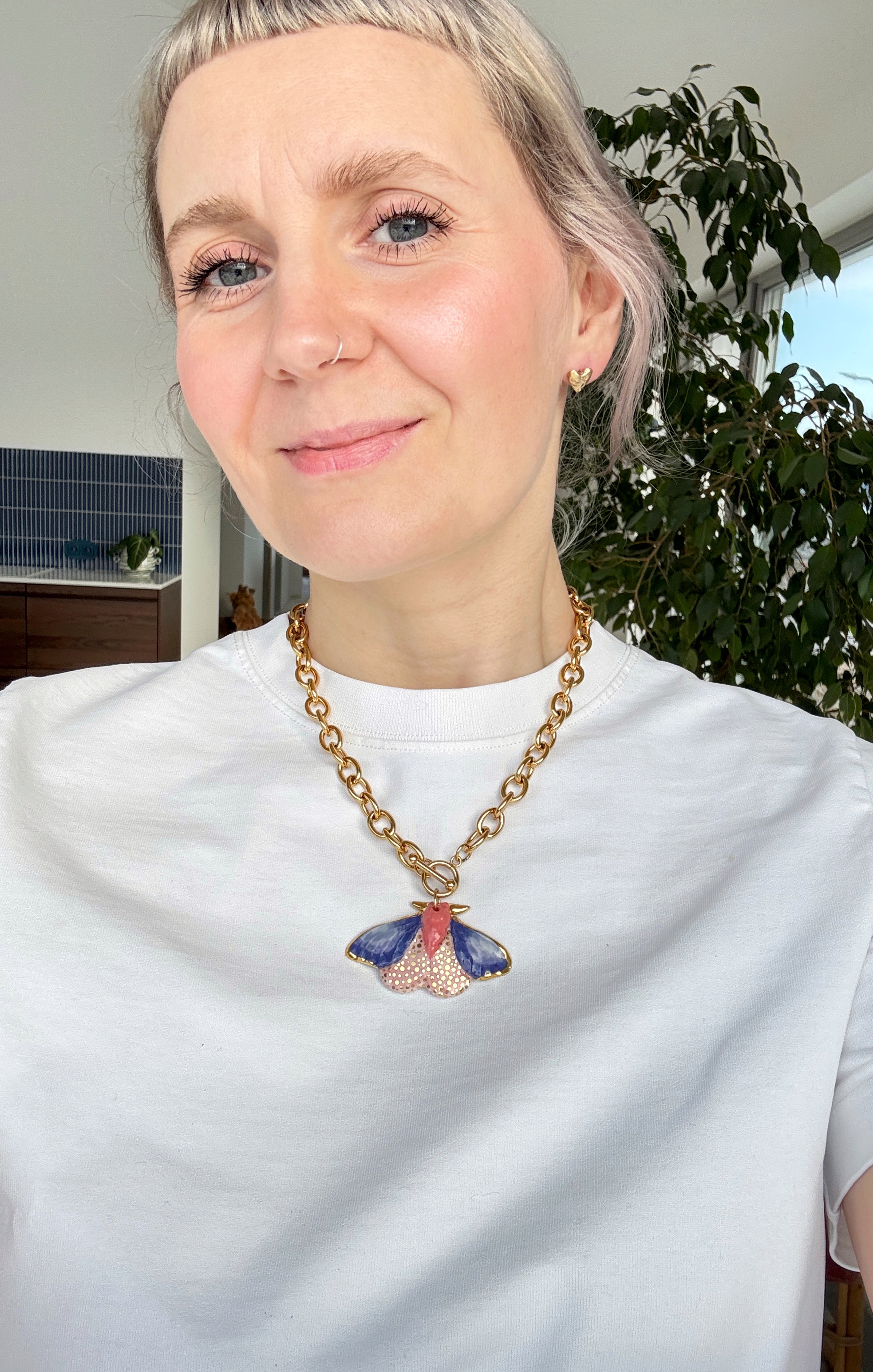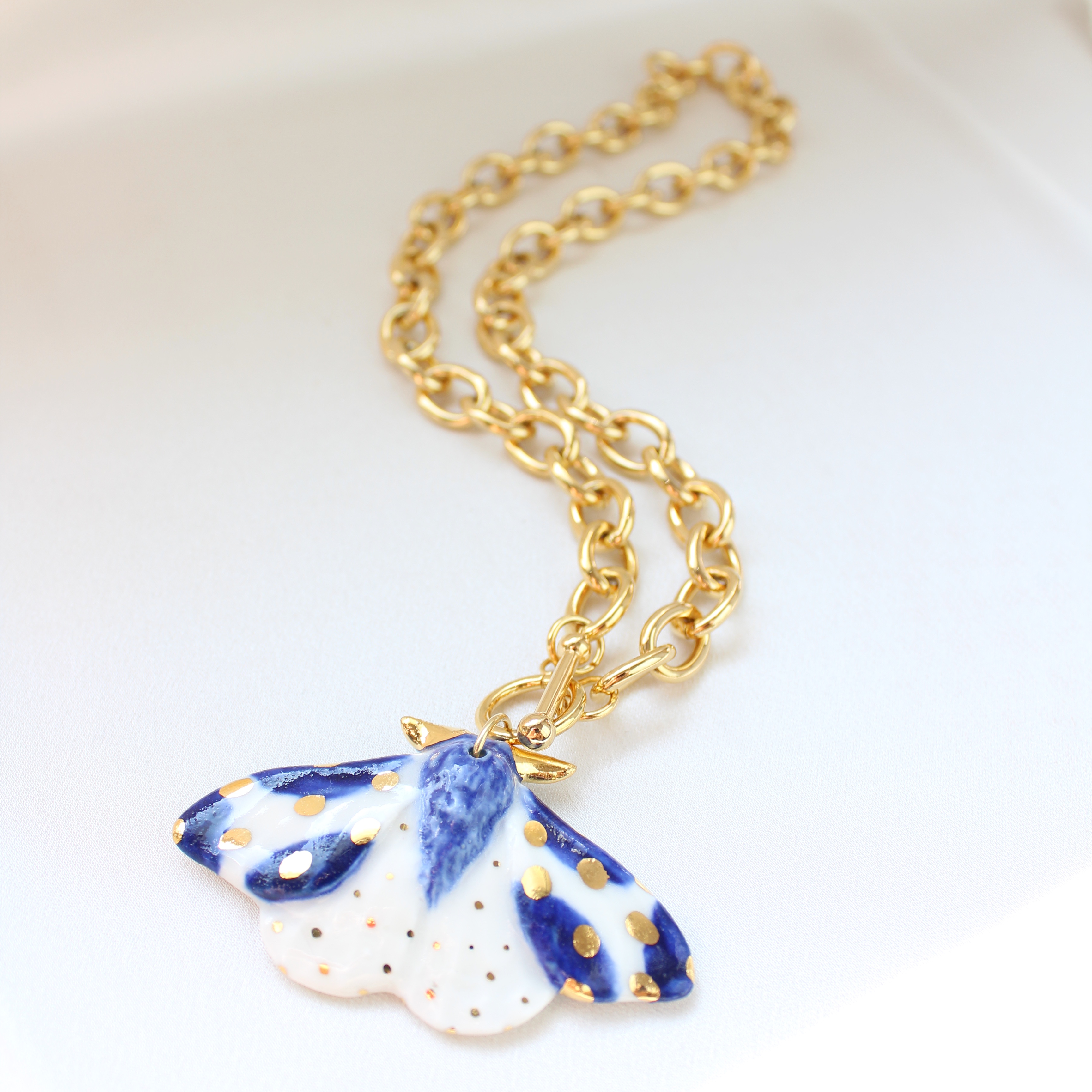 Porcelanowa zawieszka w kształcie ćmy na łańcuchu wykonanym ze stali szlachetnej w kolorze złotym.