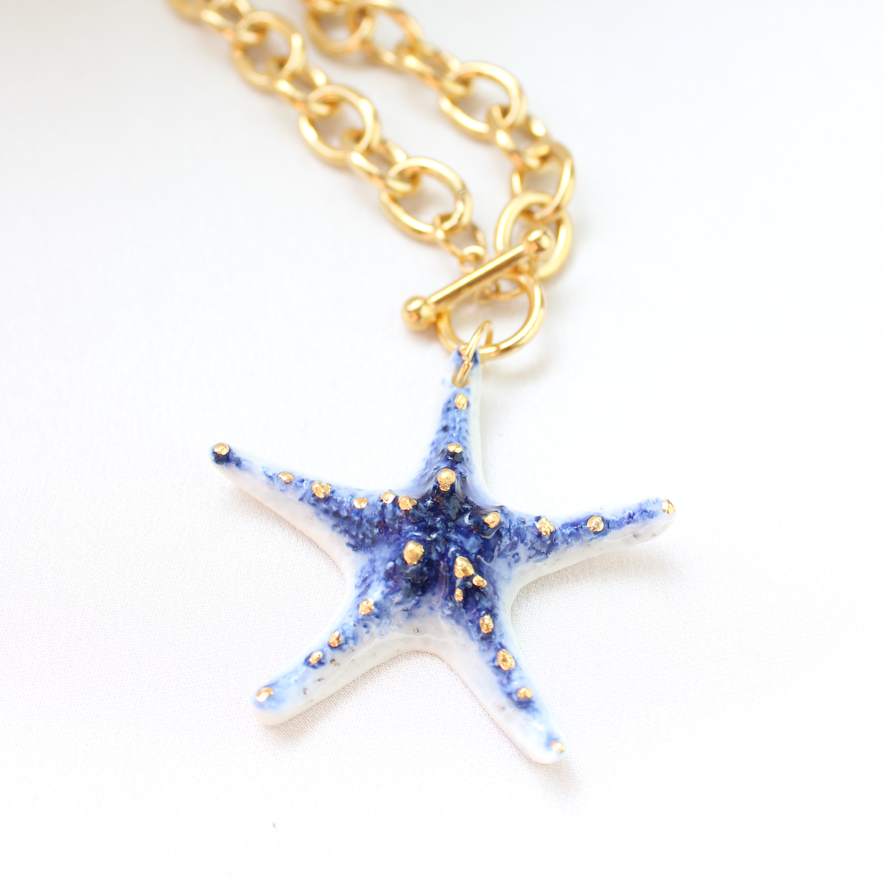Porcelanowa zawieszka w kształcie rozgwiazdy   na łańcuchu wykonanym ze stali szlachetnej w kolorze złotym.