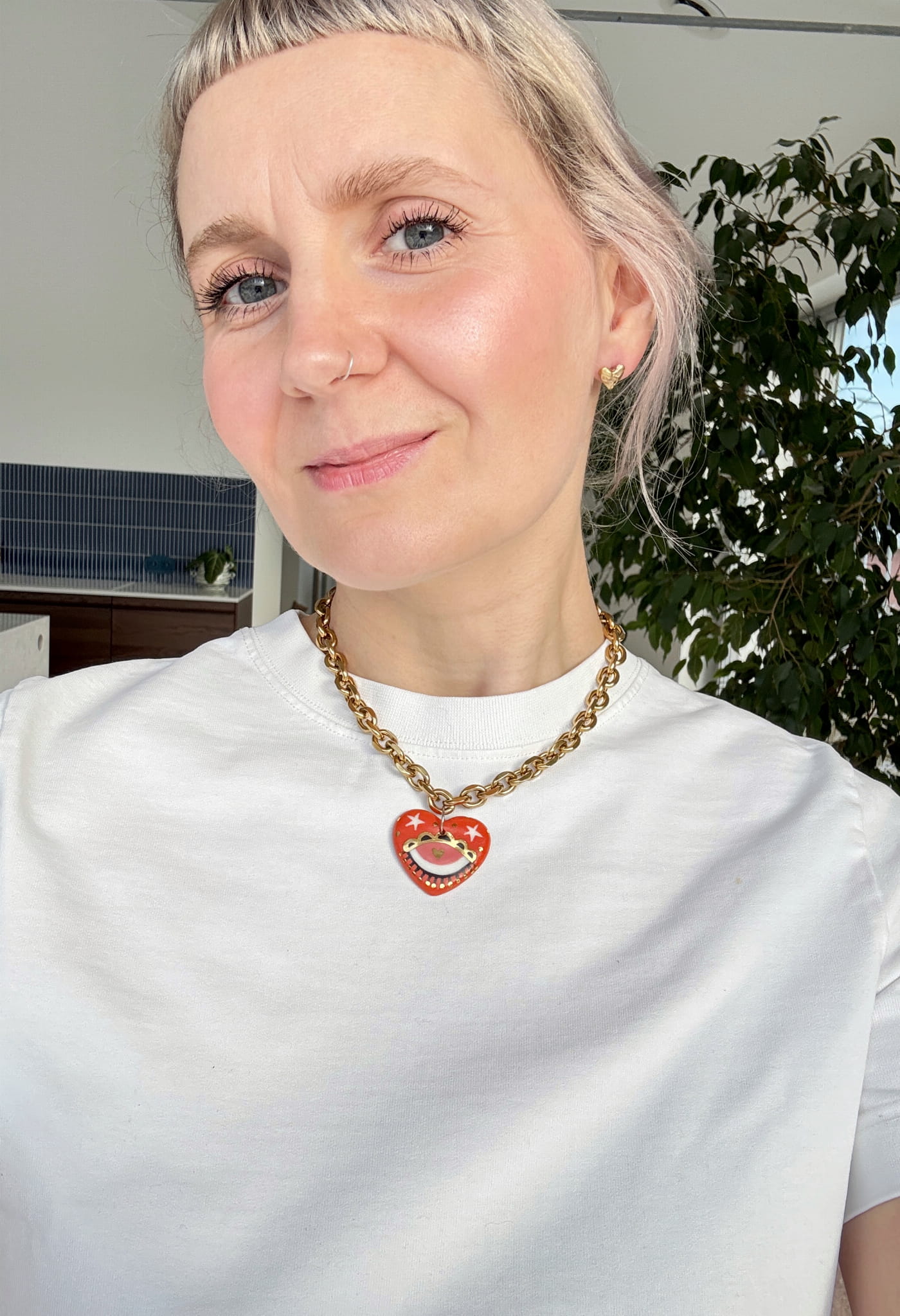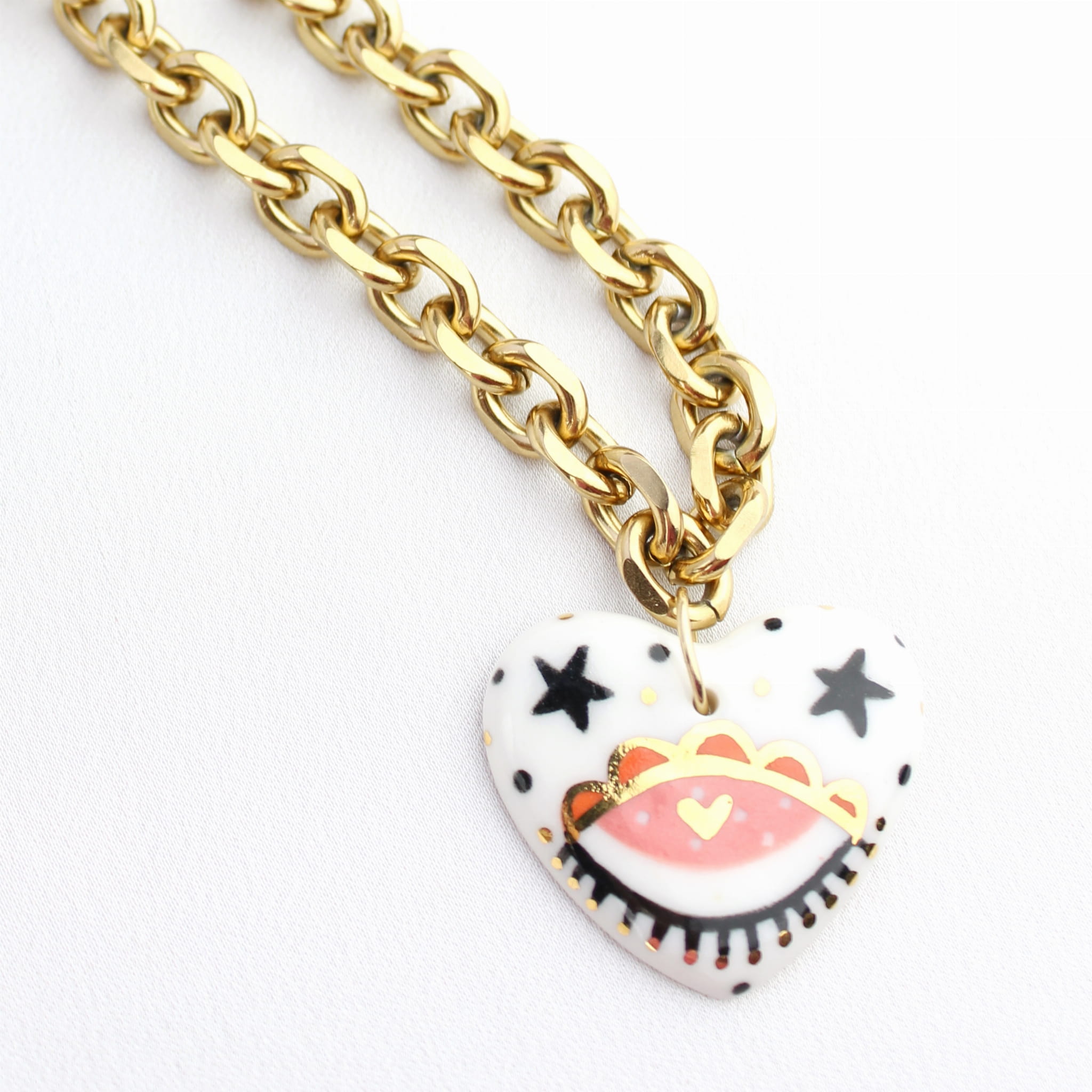 Porcelanowa zawieszka w kształcie serca na łańcuchu wykonanym ze stali szlachetnej pokrytym 18k złotem.