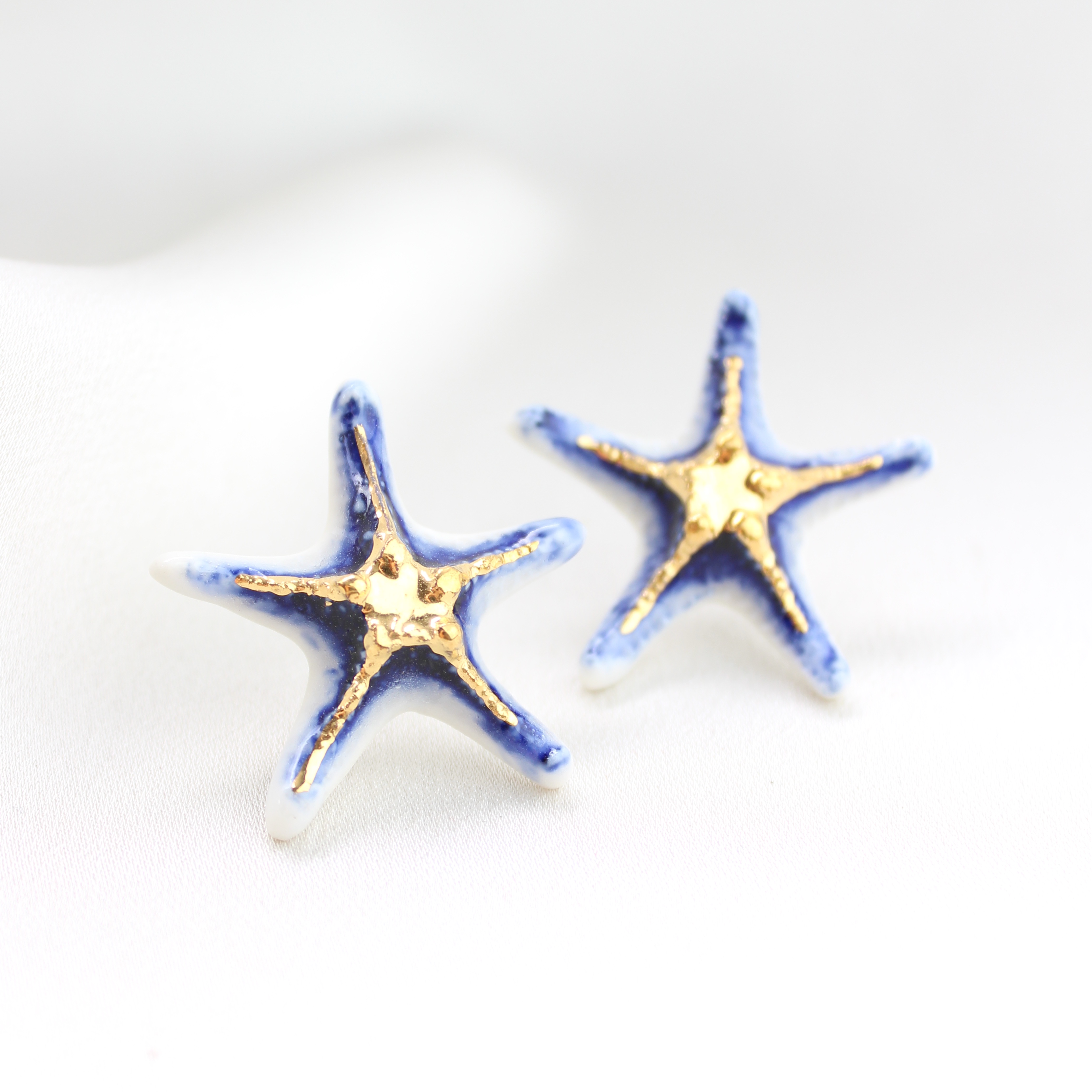 Kolczyki wykonane z porcelany, zdobione 24k złotem. Sztyfty wykonane zostały ze stali szlachetnej.
